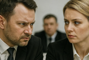 She cautiously peered through the gap. Sergey sat at the bedside with papers in his hands, while a man in a strict suit with a briefcase — a notary — stood nearby. The sight was so unexpected that for a moment Lyudmila hesitated: should she go in or wait?